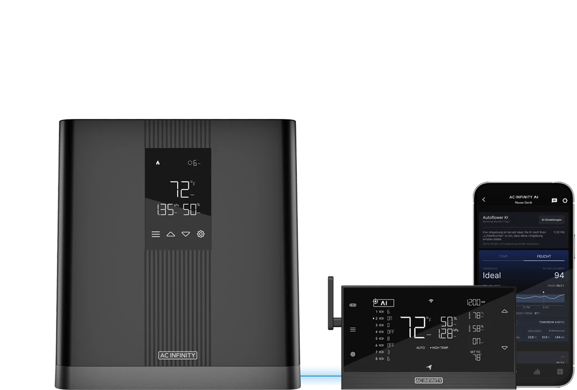 Mit VPD- und Temperatur-Programmierung sowie einer kabelgebundenen Sensor-Sonde für präzise Messungen und Kontrolle. Der Ventilatormodus sorgt für Frischluftzufuhr.