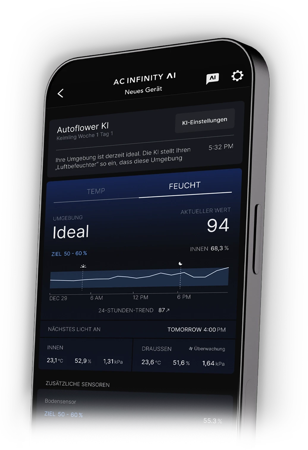 Verfolgen Sie Ihren Anbau mit KI-gesteuerten Diagrammen und Verlaufsberichten, die jede Anpassung für optimale Erträge hervorheben. Die Steuerung überwacht und justiert Ihren Anbaubereich, lernt aus vergangenen Ergebnissen und verbessert Stabilität und Leistung.
